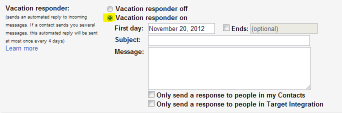 PS: Messages that are classified as spam and addressed to a mailing list you subscribe to will not be sent a vacation response.